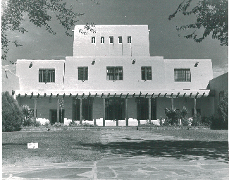 The two-story main structure was flanked by flat-roofed wings projecting to the north, south, east and west. A traditional portal runs along the main west façade. While hollow tiles, steel and concrete replaced adobe bricks, the undulating molded exterior and corner buttressing recalled the traditional regional architecture and the monumentality of the mission churches.