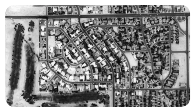 PHOTO: Vista Larga Subdivision, 1963. Except for a few lots, the house construction is complete. Note Indian School Road running horizontally at top of photo is now paved, while commercial development along north end of Girard Boulevard has yet to be started  (right side of the photo). Source: MAGIC, University of New Mexico.