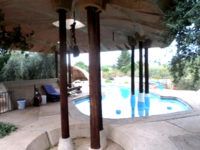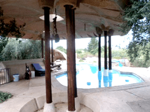 They were working on a concrete shade cover for the swimming pool, which had been cast on the ground using a sand form. I had arrived on the day it was going to be lifted from the sand form and secured overhead to telephone poles. The shade cover was lifted by two large industrial cranes, using hooks cast in the concrete.