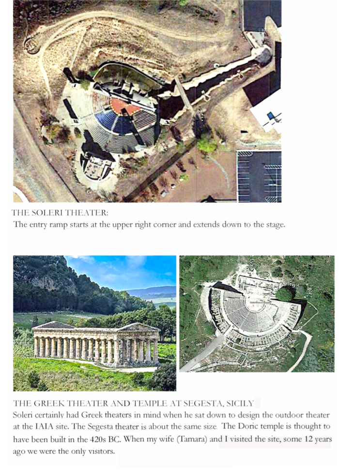 Soleri was also an on-site design artist, making changes as the work progressed. His drawings were concept-driven and did not contain construction details. My assignment was to visit the site, at least once a week, and review progress. It occurred to me that Soleri’s drawings did not show any night lighting. I contacted Lloyd New to see if the theater was to be used only for daytime productions? After that, Soleri was asked to design the concrete light towers. I think that Soleri designed the theater with the intent that it would be used exclusively for daylight productions. In his master plan for IAIA he had an indoor theater located north of the outdoor with large windows viewing the outdoor theater stage and archways.
