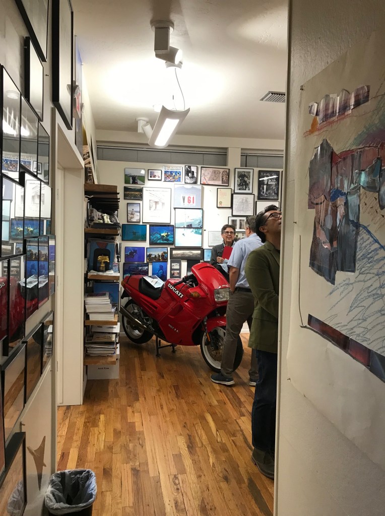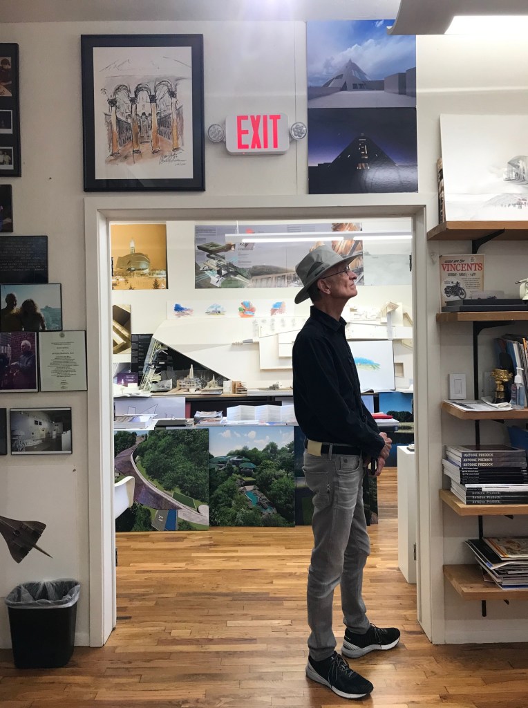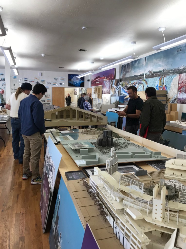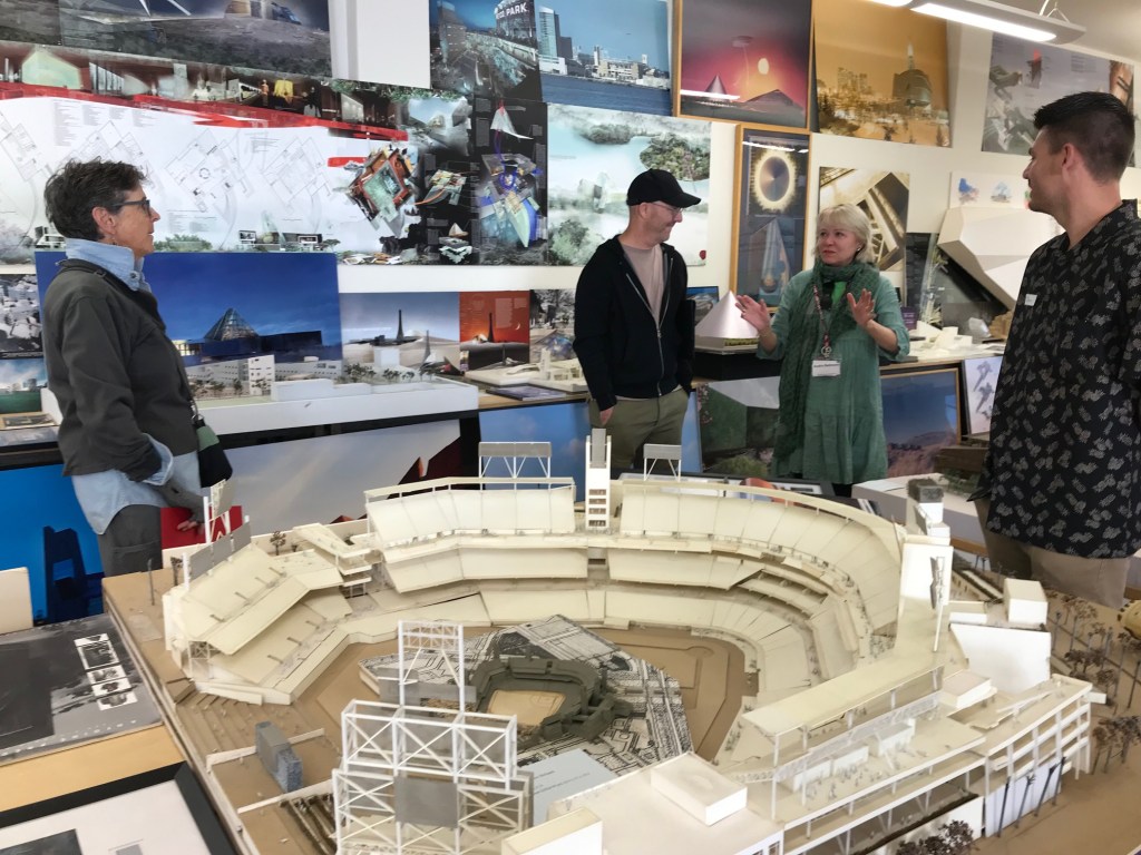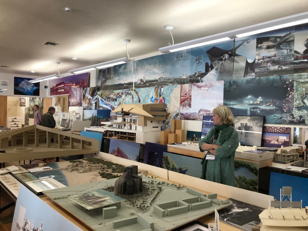 We started at the Predock Center, led by Dr. Audra Bellmore and her team. On display were models, sketches, drawings, collages, motors and memorabilia – artifacts from a long and storied architectural practice. The tour provided an opportunity for the architecture students to study buildings commissioned from across the globe. And Antoine Predock was digitally present – touring and visiting with colleagues.
