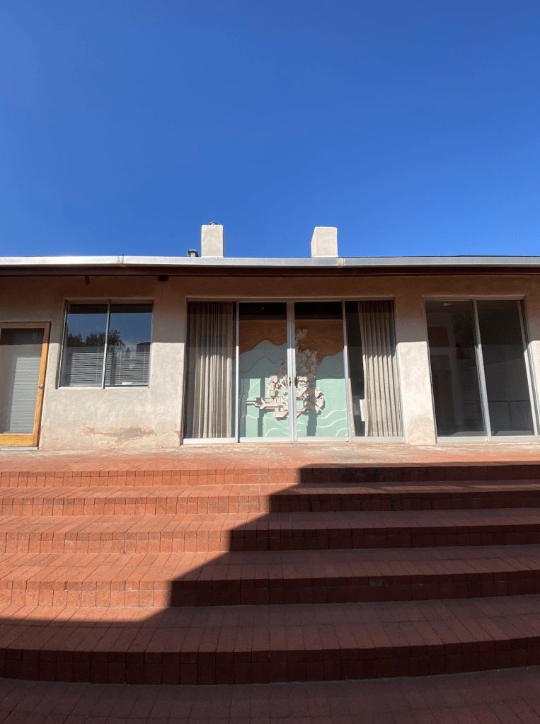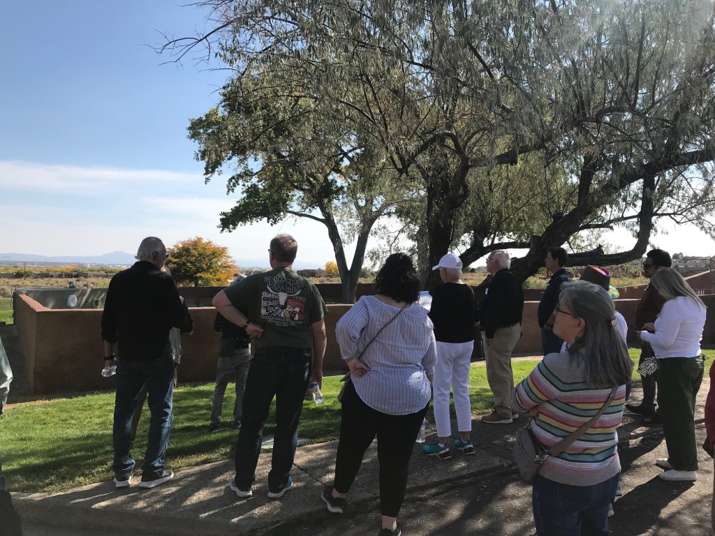 In the afternoon we met at La Luz, the first and ground-breaking commission of Predock’s, now over 50 years old. The community is made up of 96 clustered adobe townhouses, communal plazas and recreational spaces, all with stunning views to the Sandia Mountains and Rio Grande bosque. We toured three different units: one with a recent, modern interior renovation, another restored to its original state, and a third unit which was two-stories. Professor Emerita Anne Taylor and fellow resident guides talked not only about the sustainable housing design but also about the landscape transition which reflects a greater awareness of our precious limited water and climate change. La Luz is internationally recognized and is on the State Register of Cultural Properties.